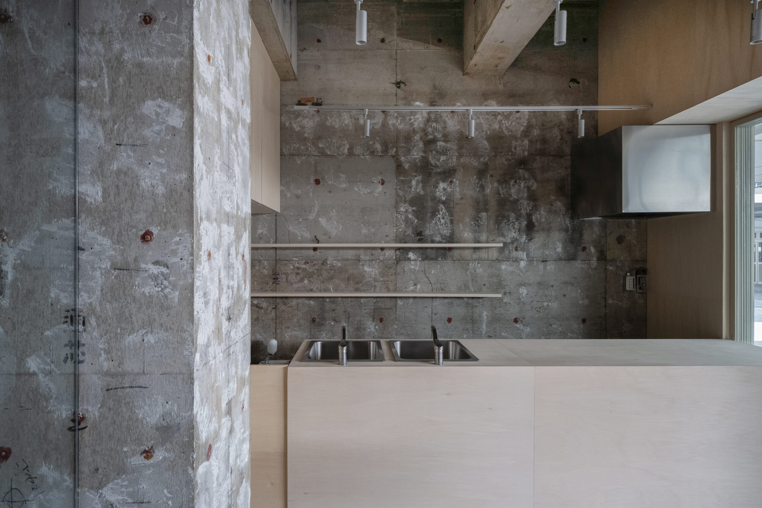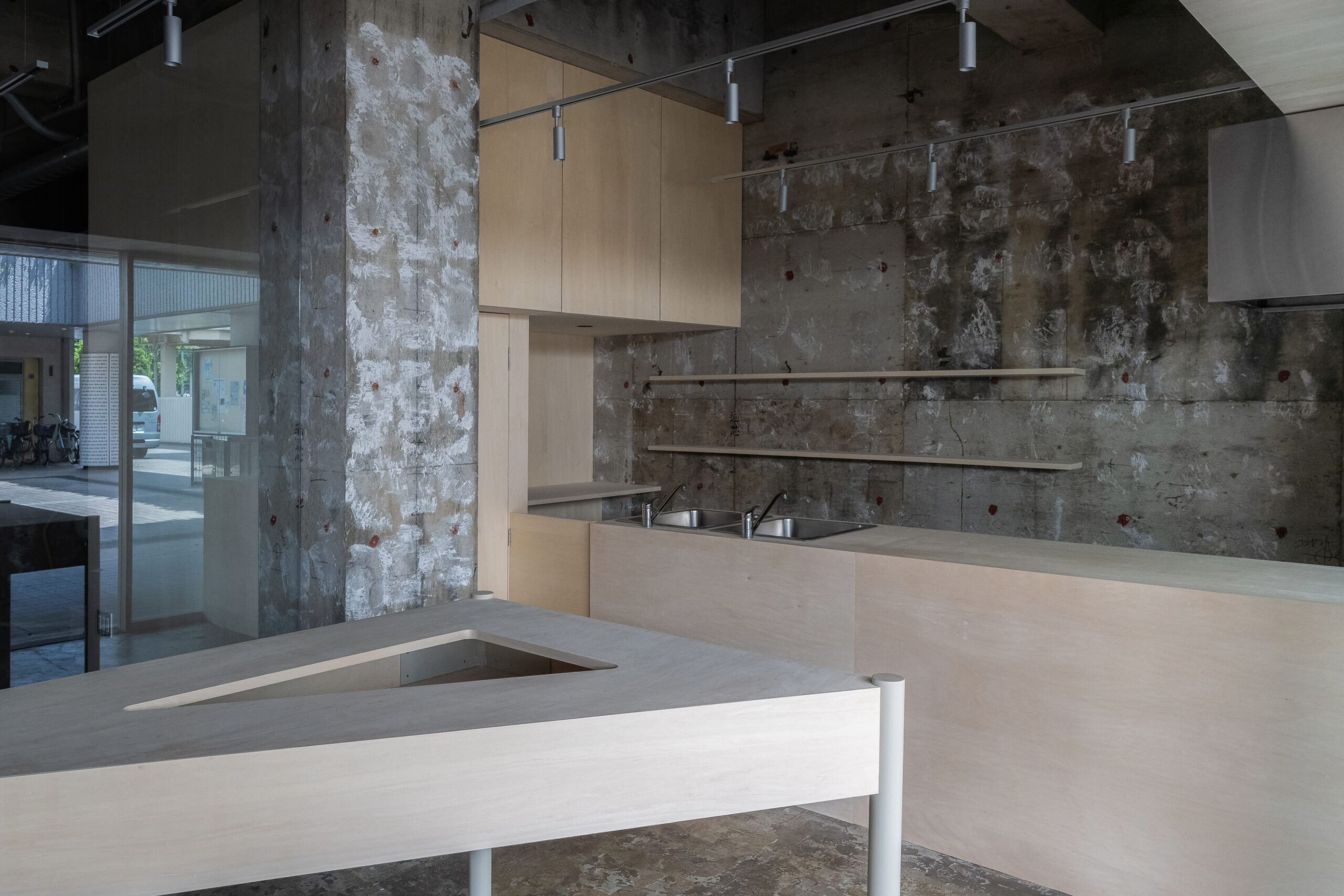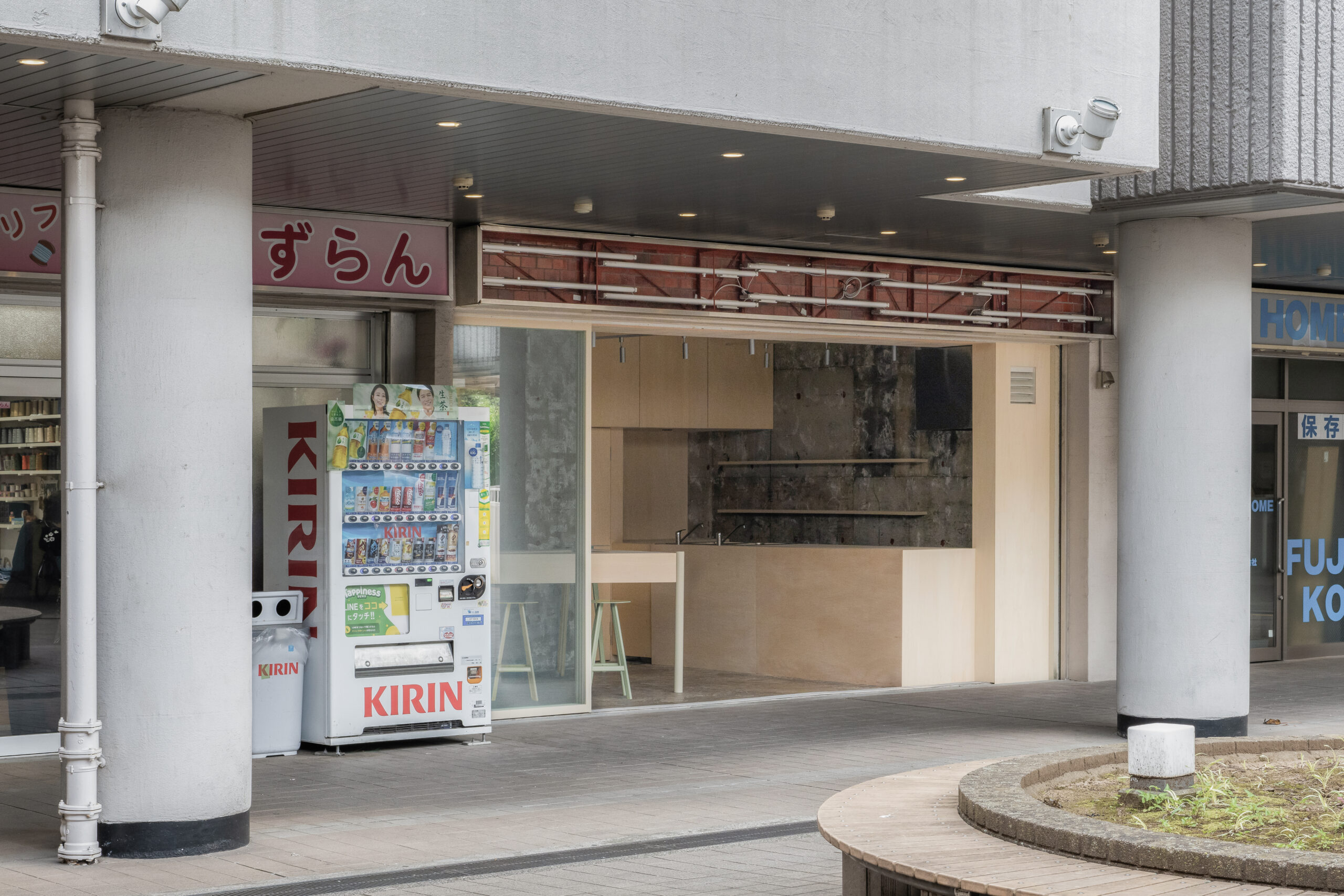 団地の一角に設けられた、クラフトビールスタンド。周囲には住戸が連なり、買い物や通勤といった日常の動線が交差する場所に位置しています。外から目的を持って訪れるというよりも、通り抜けや待ち合わせ、ふと立ち止まる行為が自然に起こる環境として、この場所を捉えました。店内は、構造体をそのまま露出させたコンクリートの躯体を背景に、木製のカウンターと什器を最小限に挿入しています。新しくつくり込むのではなく、すでにある構造とスケールを受け止めながら、成立する輪郭を探っています。カウンターは、立つ・腰掛けるといった使い方を明確に定めず、団地の共用部に置かれた家具の延長のような存在として設えています。スツールやテーブルも特注で製作し、形や寸法を抑えることで、使われ方が固定されない状態としました。ガラス越しに見える内部の様子や、昼と夕方で変わる光の入り方も、特別な演出として扱うのではなく、団地の時間の流れの一部としてそのまま受け止めています。この店は、目的地として構えた場所というよりも、団地の中に元からあった風景のひとつとして存在することを目指し、住人や通行人が、それぞれの距離感のまま関われる、生活の延長線上にある存在です。