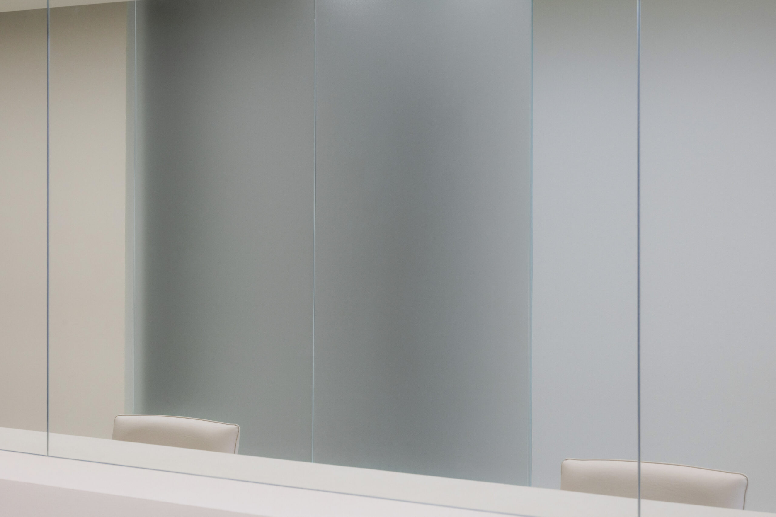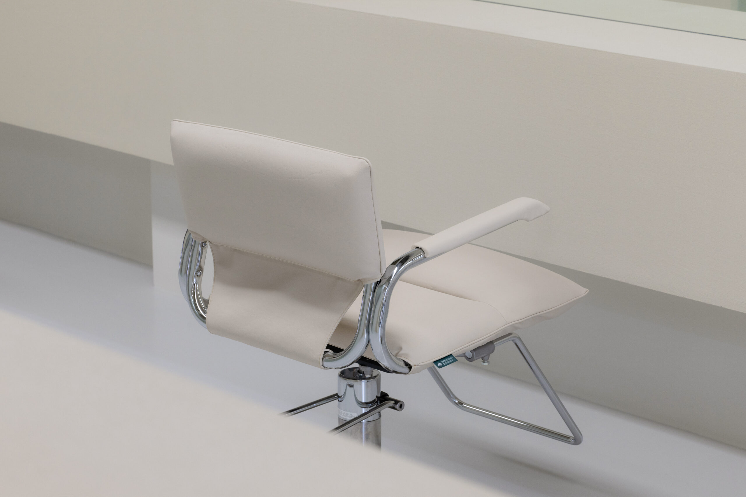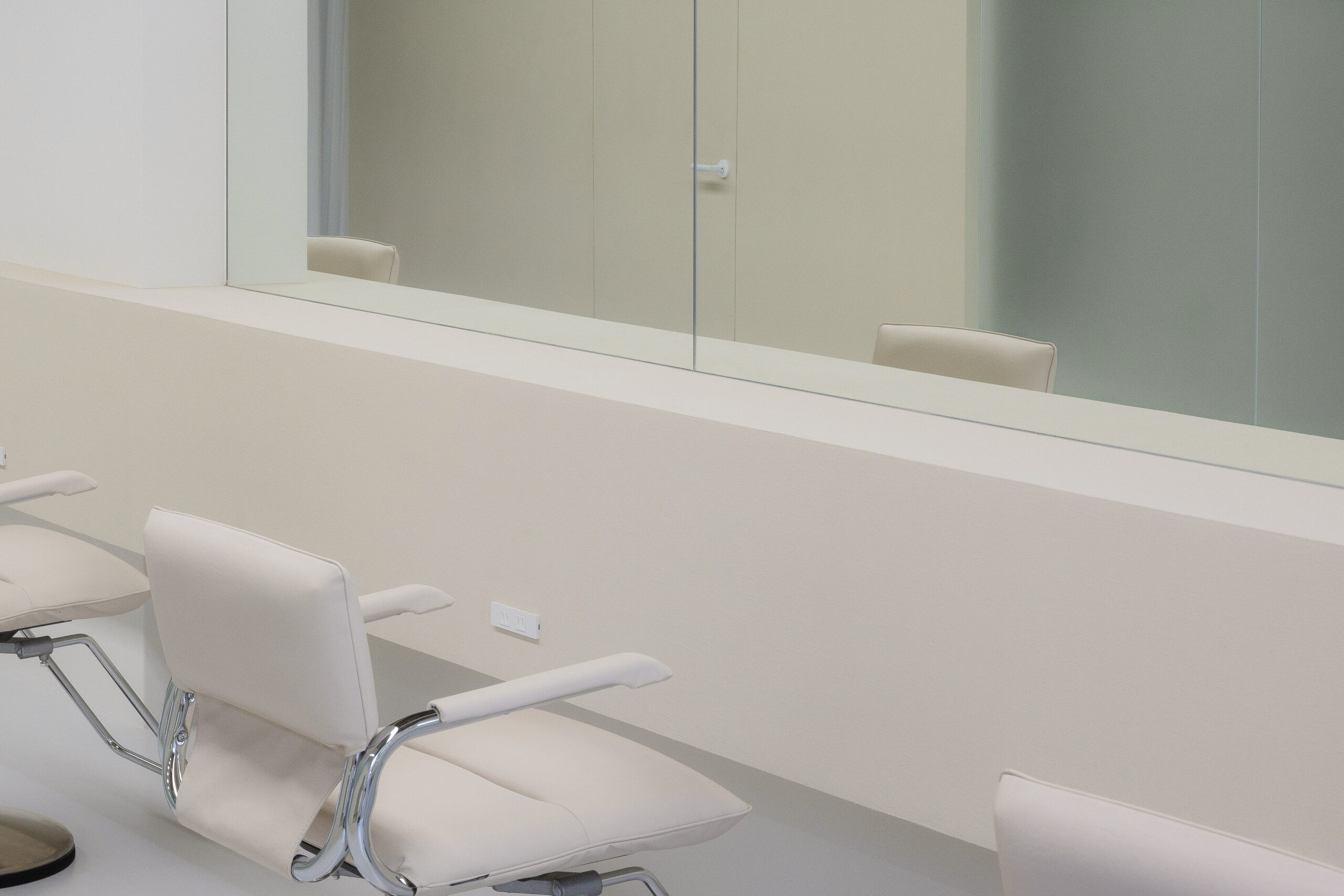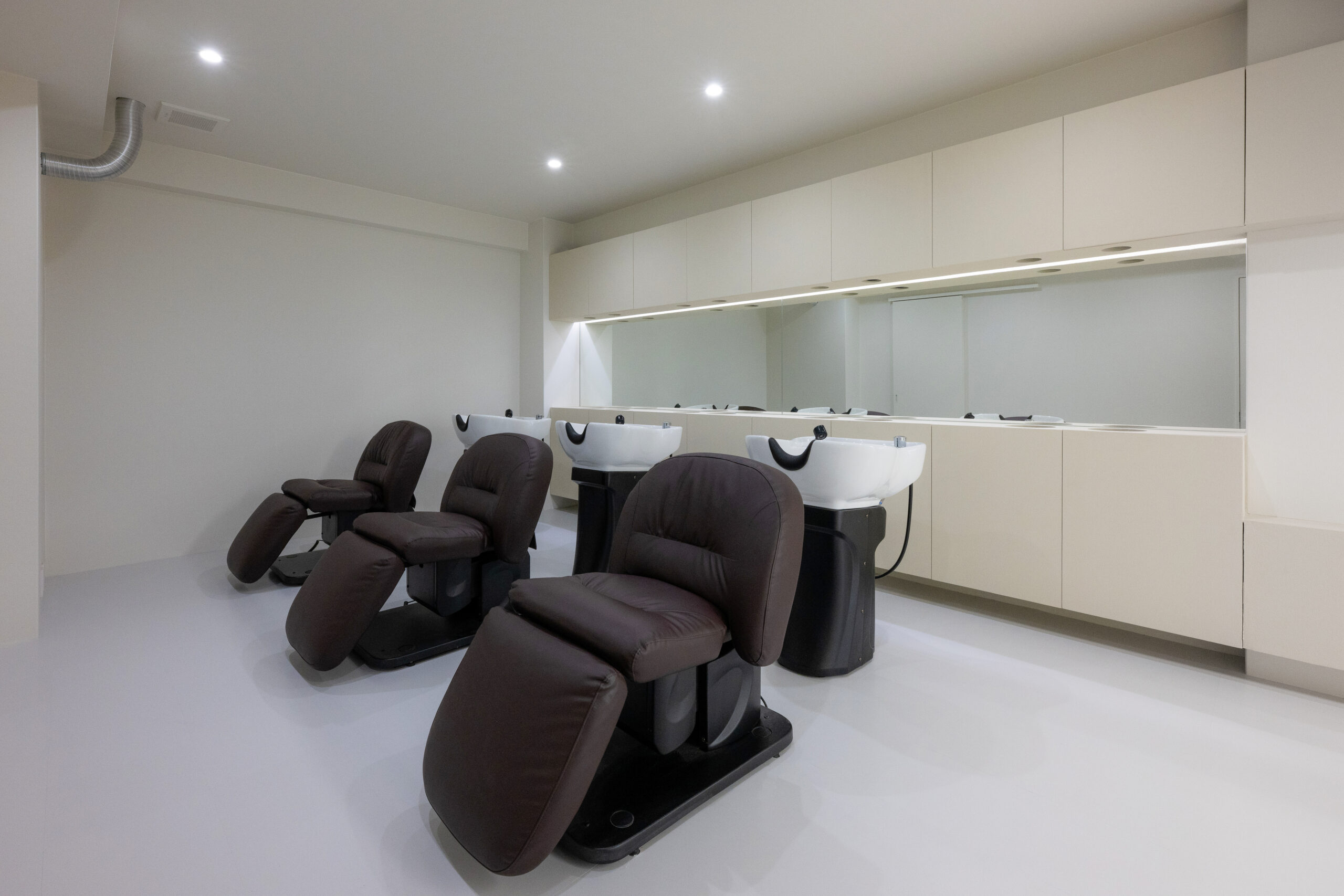 空間の構成自体はシンプルですが、セット台とシャンプー台の背面のキャビネットのボリュームがセット面からシャンプー台の背面まで連続してつながることで、細長いレイアウトに一本の軸を通し、動線と視線に自然な流れを生み出しています。さらに、正面の壁面には端から端まで大きく設けた鏡が空間を水平に引き伸ばし、奥行きの印象をより一層引き立てています。